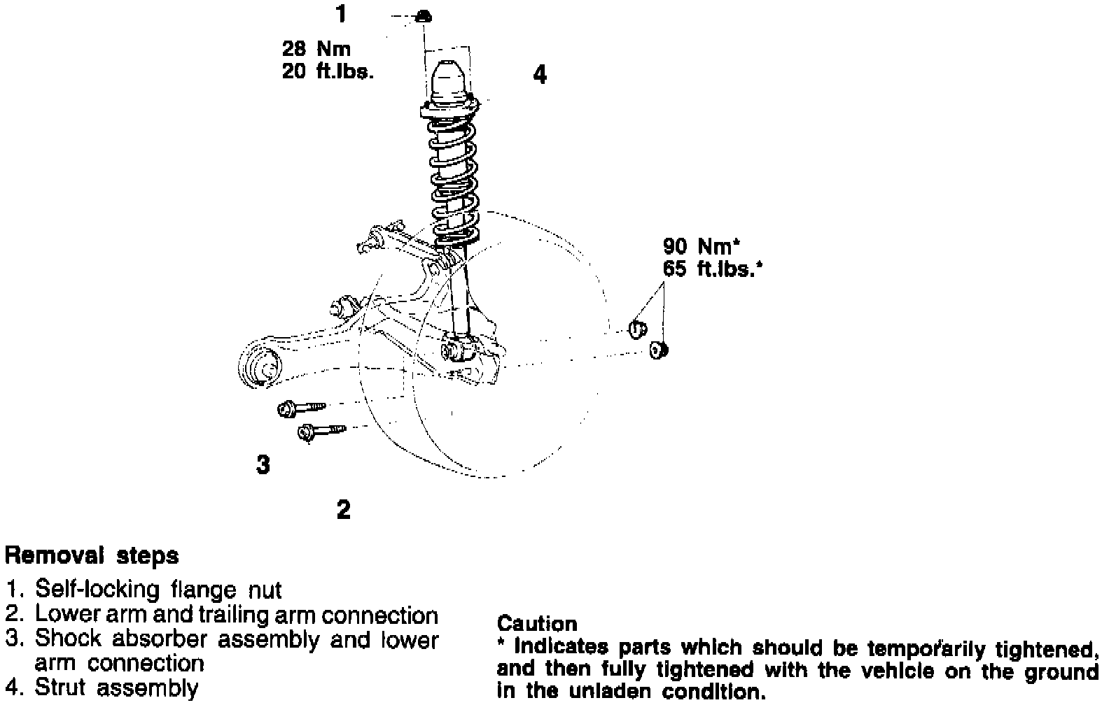 3. Using a suitable jack, support lower suspension arm, then disconnect shock absorber from upper and lower mounting, then remove from vehicle.