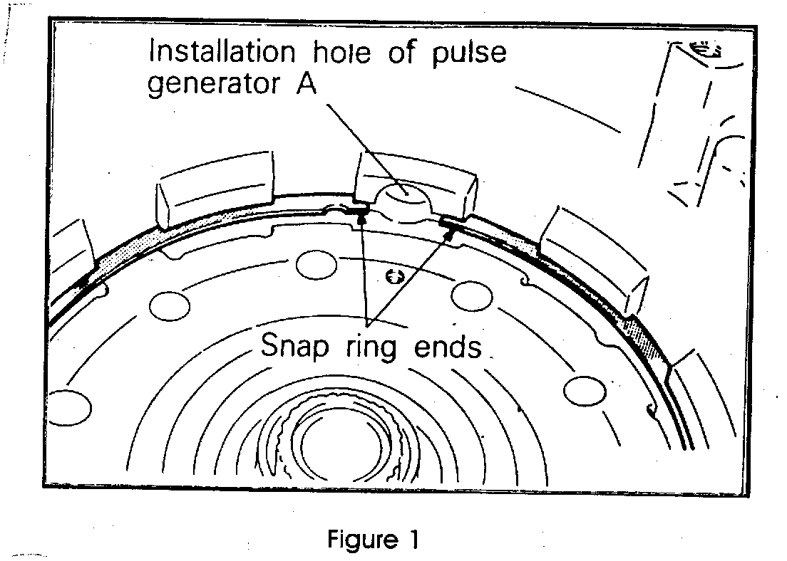 If the car will roll in only one direction, then either the band/servo is mechanically locked on, or the center support snap ring has snagged one of the sun gear shell holes. This is caused by not lining up the gap in the center support snap ring with the hole in the top of the case (figure 1). When pulse generator "A" is installed, it pushes the end of the snap ring into the sungear shell.