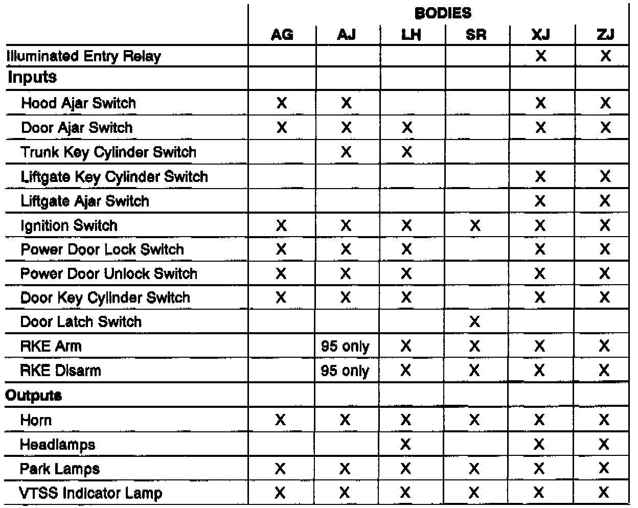 While in diagnostics mode, a horn pulse should occur at each of the following events, which indicates proper operation. (Note that some vehicles equipped with the vehicle theft security system are also equipped with illuminated entry (see chart). When in diagnostic mode, it is recommended that the illuminated entry relay be removed.