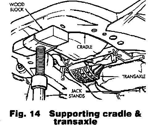 8. Position a jack stand under front of cradle and at center of transaxle cradle assembly mount. Raise jack stand at transaxle mount until transaxle just lifts off cradle assembly.