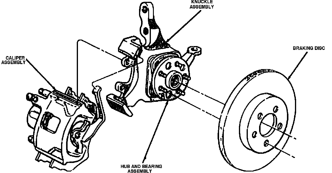 The single piston, floating caliper disc brake assembly, consists of the rotor, caliper, pads and the driving hub. The caliper is mounted through bushings and sleeves by two through bolts threaded into an adapter. Two machined abutments on the adapter position and align the caliper fore and aft. The mounting bolts and bushings control the movement of the caliper and the piston seal to assist in maintaining proper pad clearance.