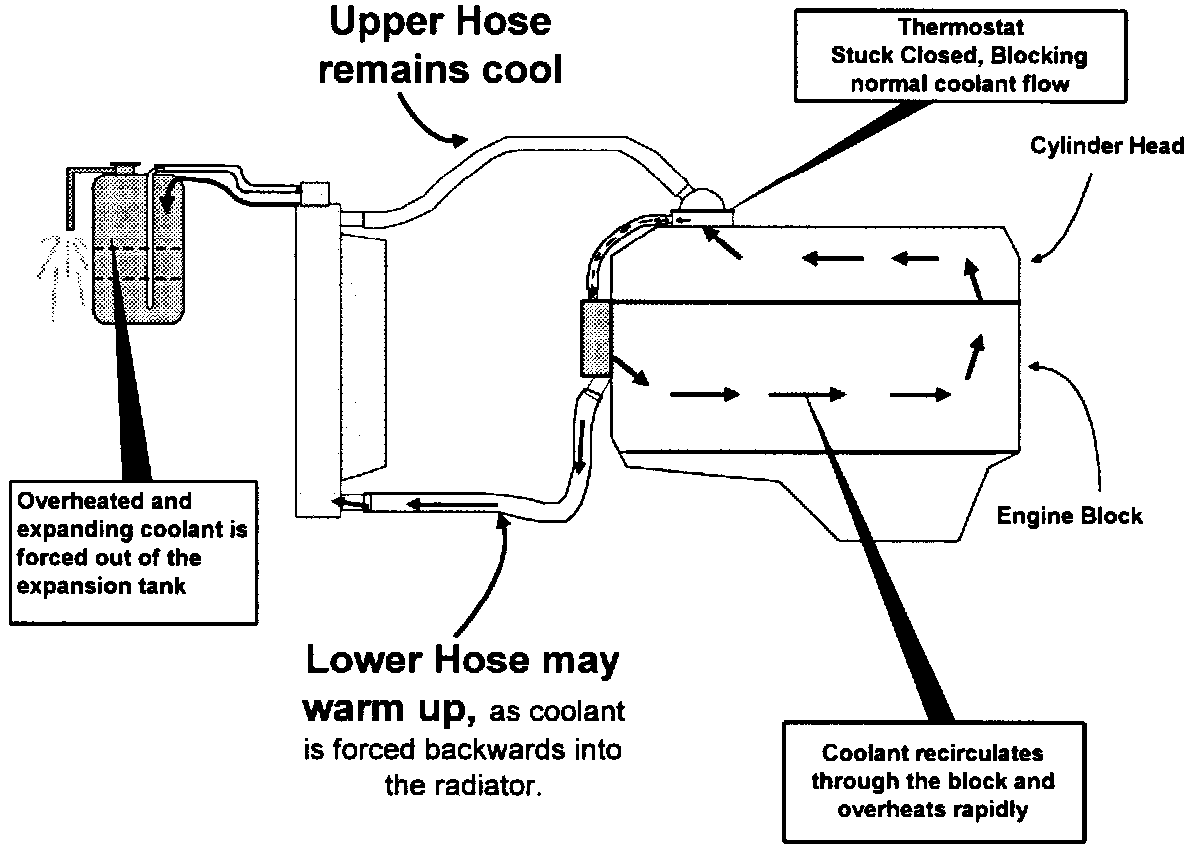 Stuck Closed - The thermostat fails to open during engine warm-up. The engine warms up normally, however when the engine reaches normal operating temperature it overheats rapidly. All coolant flow to the radiator is blocked.