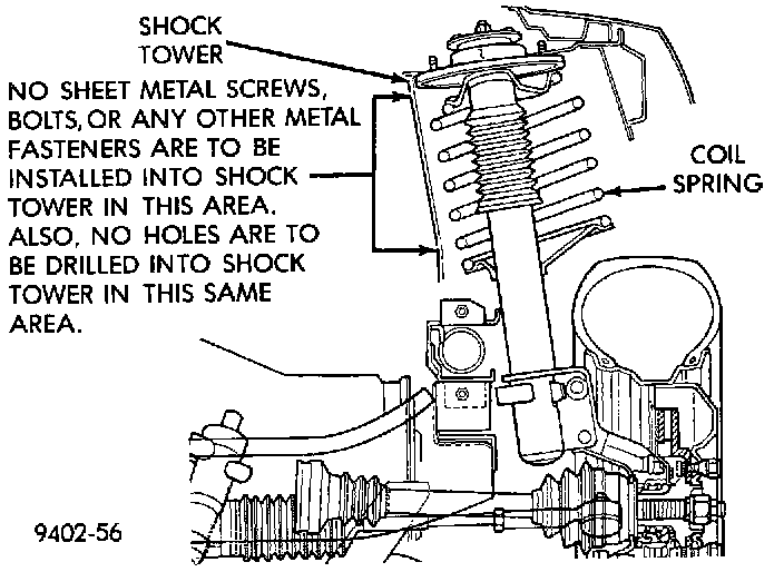 CAUTION: At no time when servicing a vehicle, can a sheet metal screw, bolt, or other metal fastener be installed in the strut tower to take the place of an original plastic clip. Also, NO holes can be drilled into the front strut tower in the area shown in for the installation of any metal fasteners into the strut tower.