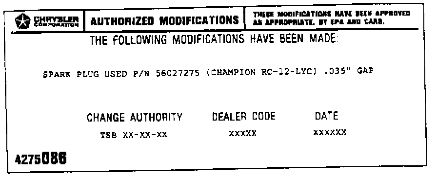 1995 vehicles built between Oct. 24, 1994 and Feb. 17, 1995 (MDH 10-24-XX thru 02-17-XX) will require reprogramming the Powertrain Control Module as described in TSB 18-15-95 dated May 5, 1995 to meet Emissions Certification. In all other 3.5L equipped vehicles, the new spark plug may be used alone without other modifications. You must complete an Authorized Modification Label, P/N 4275086, and install near the VECI label.