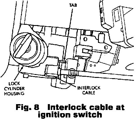 8. Depress lock tab on interlock cable and remove cable from lock cylinder housing.