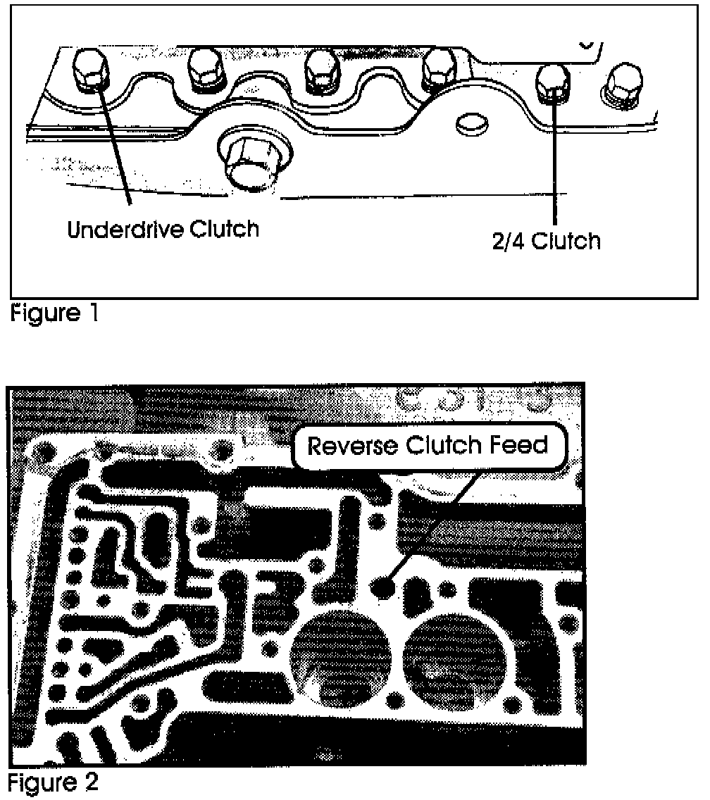 The underdrive and 2/4 clutch pressure taps must be checked for pressure when the bind-up in reverse occurs (figure 1). Any pressure observed at these taps, indicates a hydraulic cross-leak (possibly caused by warpage), leaks between the valve body or solenoid body sections, or leaks between or within the stator support and input drum. If no pressure is observed on these pressure taps, proceed to step two.