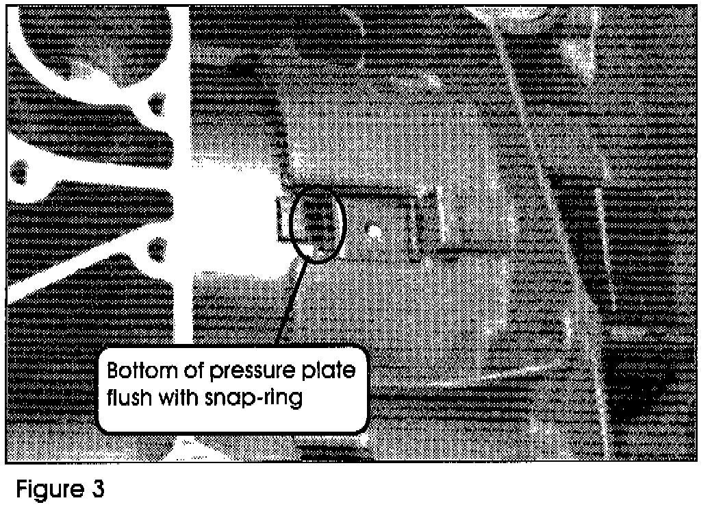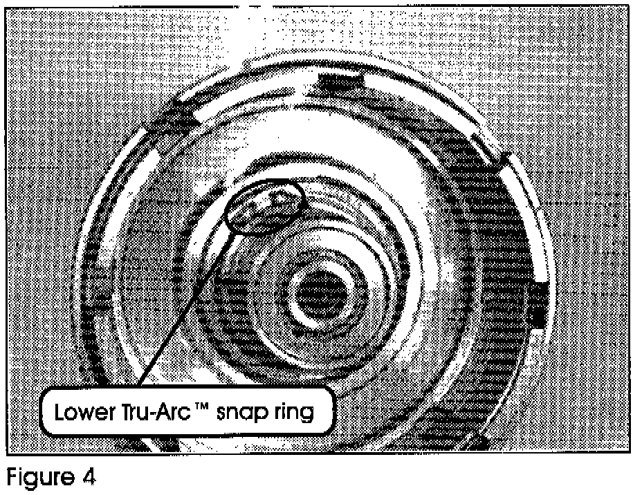 The valve body must be removed, and the reverse clutch air checked (figure 2). As the clutch applies, the bottom of the O/D-Reverse pressure plate should remain near flush with the 2/4 clutch piston housing snap-ring (figure 3). If contact is observed between the input drum and the 2/4 piston housing, the Tru-Arc snap ring that holds the input drum to the input hub is probably missing (figure 4). This is the lower of the two Tru-Arc snap rings in the drum assembly, not the upper ring used to hold the underdrive clutch return spring retainer.
