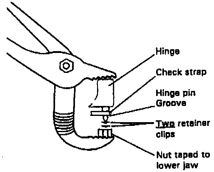 10. Install two new pin clips, p/n K6031147, onto the hinge pin and seat both clips firmly against the check strap arm using large jaw slip-joint pliers with a 5/16" nut attached as shown.