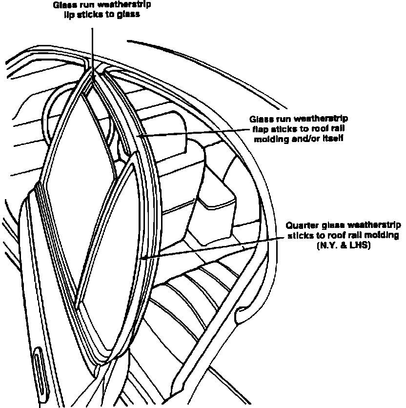 On New Yorker and LHS, rear door quarter glass weatherstrip sticks to (not behind) roof rail molding. High ambient temperatures aggravate this condition. Door is hard to open.