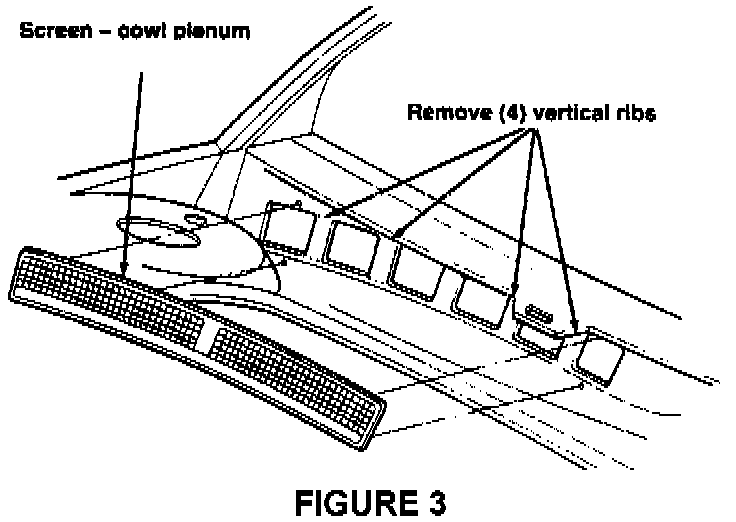 7. Remove (4) vertical ribs from the cowl plenum closure as shown using a hack-saw or saws-all, Figure 3.