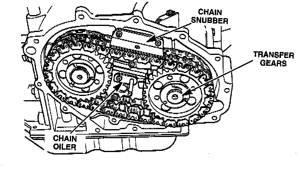 The transfer shaft is also retained with a large nut. Like the output shaft nut, the transfer shaft nut is responsible for maintaining transfer shaft tapered roller bearing preload. The transfer sprocket is splined to the transfer shaft and is also retained with a large nut. Like the output shaft nut, the transfer shaft nut is responsible for maintaining transfer shaft tapered roller bearing preload. The transfer sprocket is splined to the transfer shaft and is also retained with a snap ring. The transfer chain connects the two sprockets together and uses a chain snubber to prevent chain oscillations or vibrations.