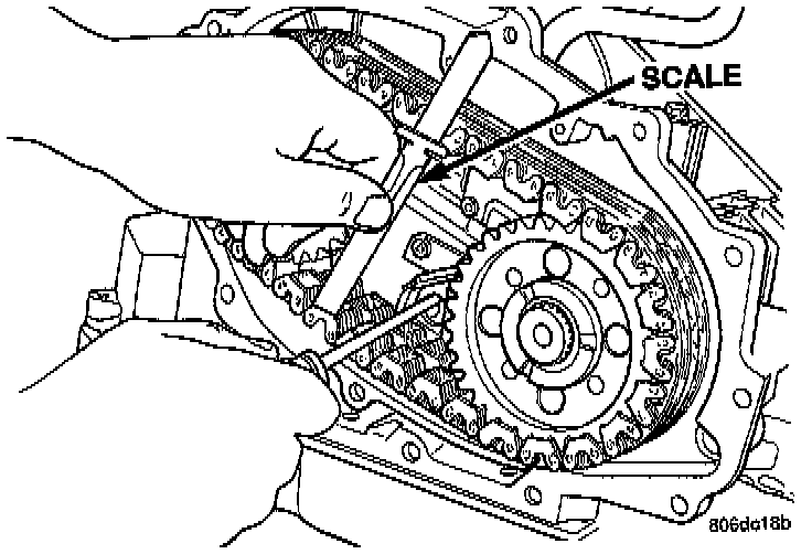 7. Measure the distance between the two marks placed on the scale. If the two marks on the scale are more than one inch apart, replace the drive chains.