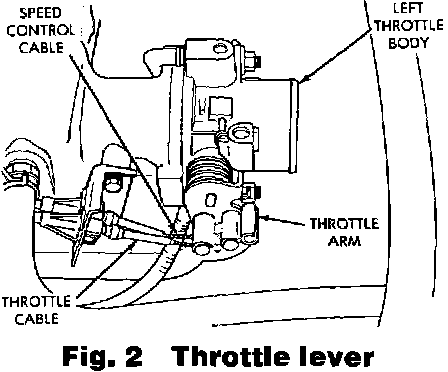 4. Remove accelerator cable and speed control cable from throttle arm, Fig. 2.