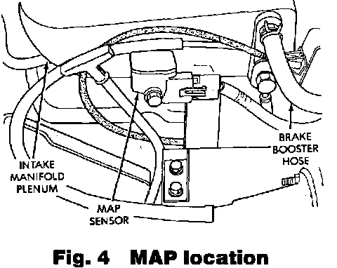 7. Disconnect electrical connector from Manifold Absolute Pressure (MAP) sensor and Throttle Position Sensor (TPS), Fig. 4.