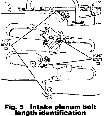 13. Remove intake manifold plenum mounting bolts. The plenum uses two different length bolts, Fig. 5.