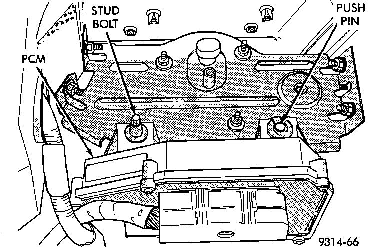The Powertrain Control Module (PCM) is mounted in the right front corner of engine compartment.