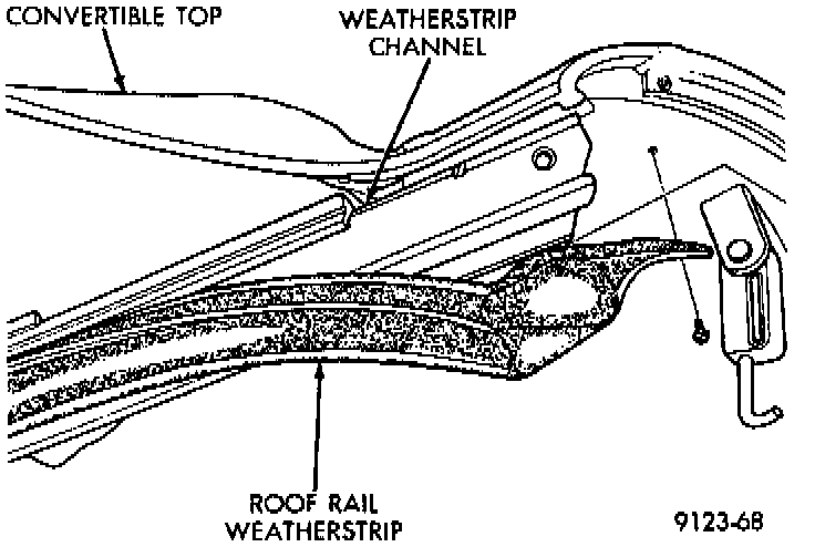 1. Remove screw holding front of roof rail weatherstrip to convertible top header.