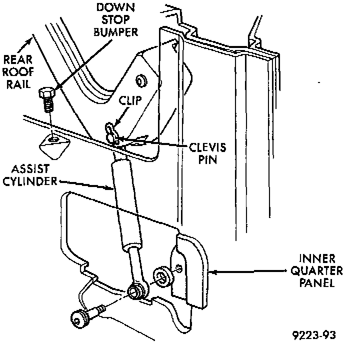 1. Remove interior trim as necessary to gain access to quarter panel to top frame attachment bolts and gas cylinder.