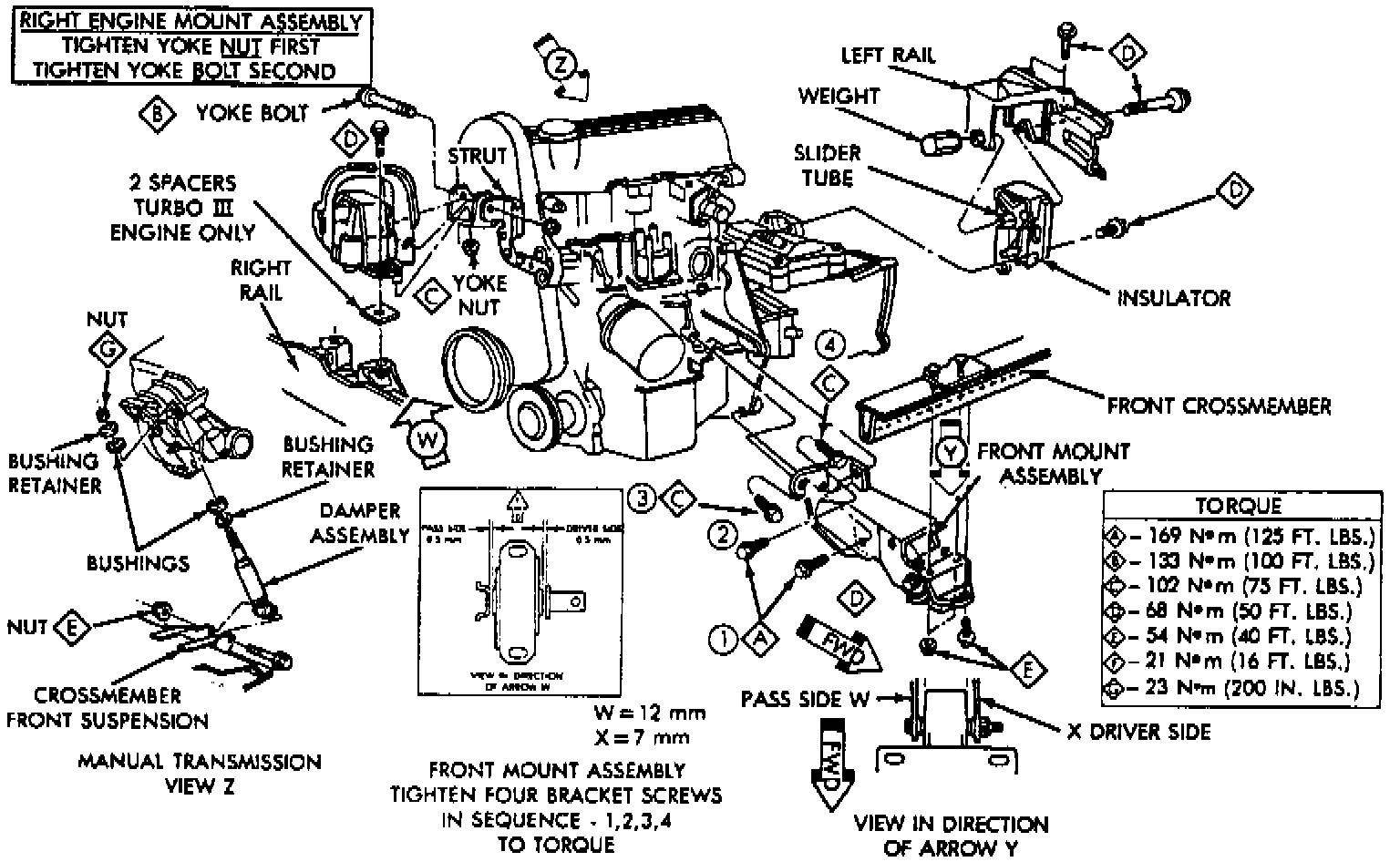 3. Remove front engine mount bracket to crossmember screws and nuts then the insulator.