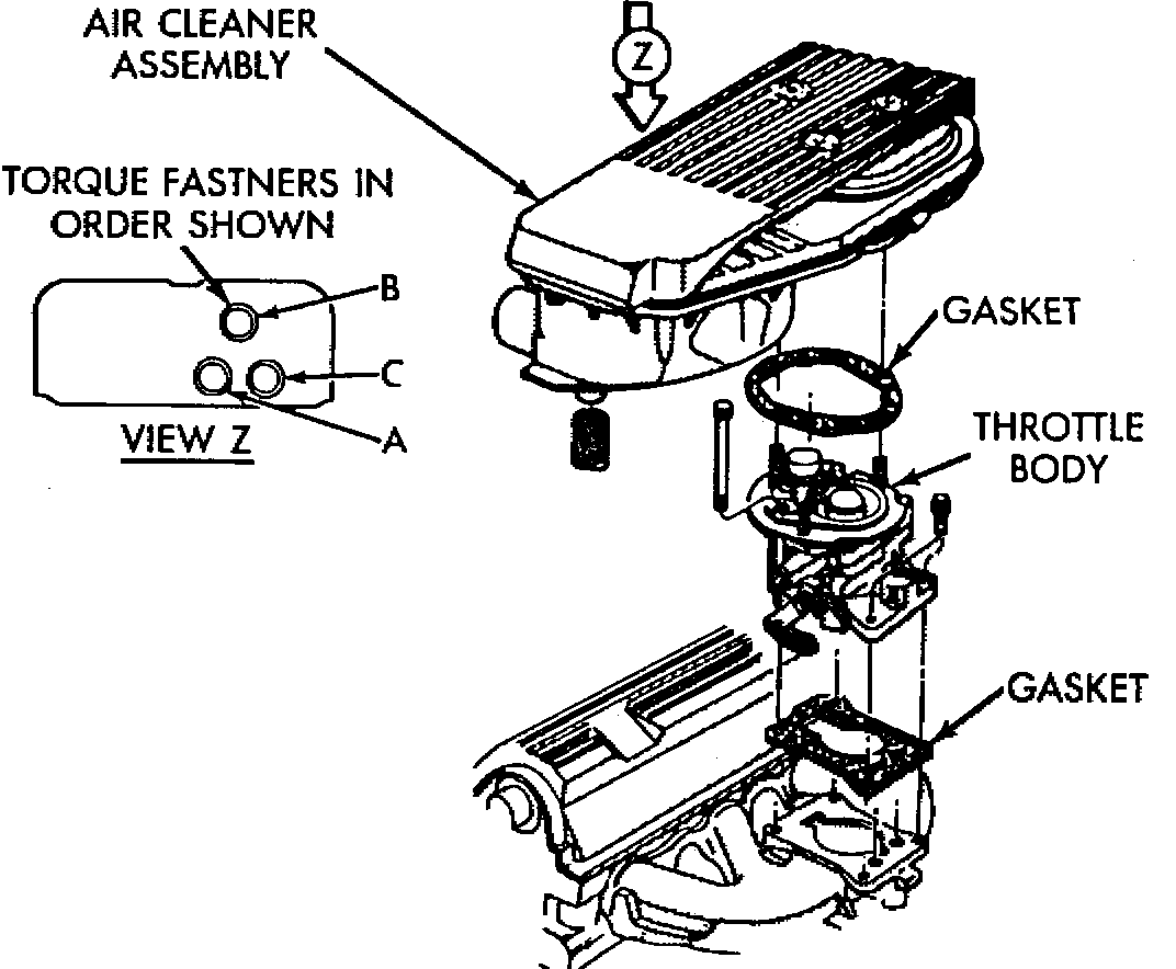 Throttle body mounted on top of the intake manifold, under the air cleaner assembly.