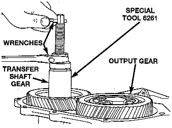 - Attach Tool L-4432, or equivalent to the transfer gear.