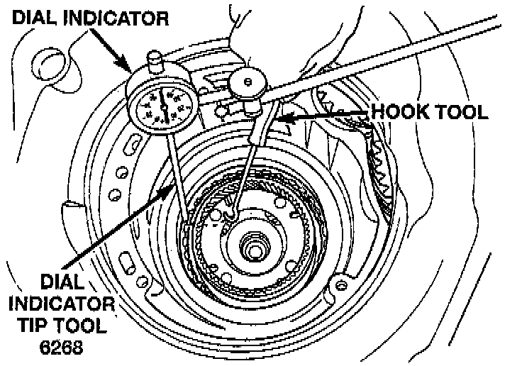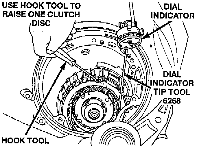 Press down clutch pack with finger and zero dial indicator. Low/Reverse clutch pack clearance is 0.89 to 1.04 (0.035 to 0.042 inch).