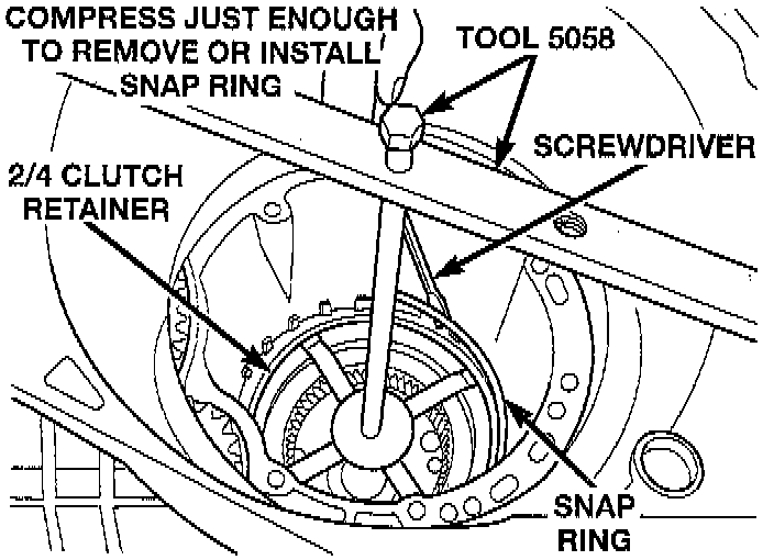 NOTE: Verify that Miller Tool 5058, or equivalent is centered properly to the 2/4 clutch retainer before depressing the tool.