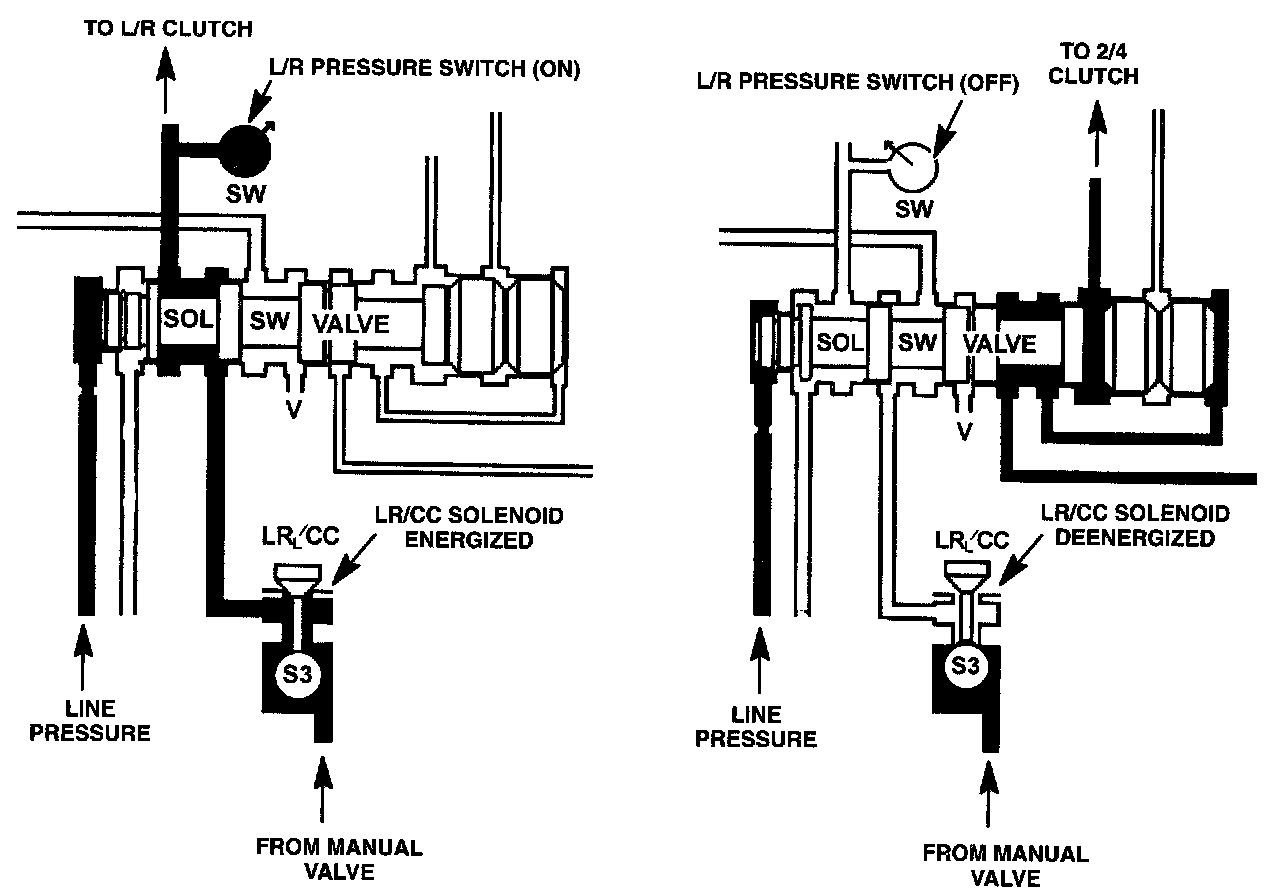 The solenoid switch valve controls the direction of line pressure from the LR/CC solenoid. When the valve is shifted to the right, it allows the low/reverse clutch to be pressurized. When it is shifted to the left, it directs line pressure to the TC and CC control valves to operate the TC clutch. The valve is shifted to the right in all positions except 2nd, 3rd and 4th gear. When the transaxle upshifts to 2nd gear, the valve moves to the left, which allows converter clutch engagement when needed. The valve must return to the right before a downshift to 1st gear can occur.