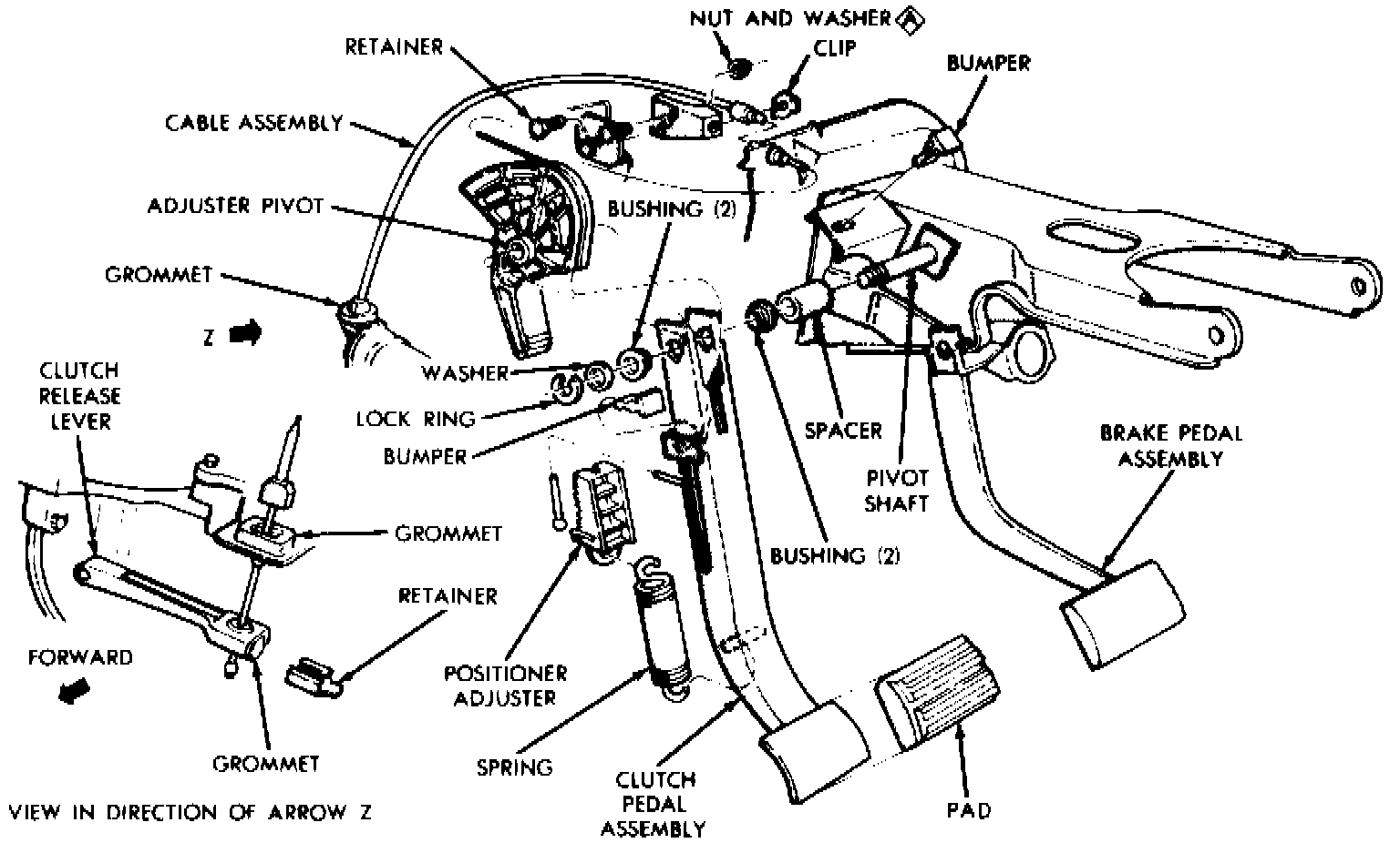 The clutch release cable cannot be adjusted. When the cable is properly routed, the spring between clutch pedal and positioner adjuster will hold clutch cable in proper position. An adjuster pivot is used to hold release cable in place to ensure complete clutch release when clutch pedal is depressed.