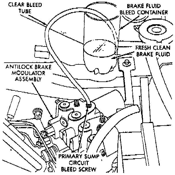 c. Open modulator assembly primary sump circuit bleeder screw at least one full turn; then, using DRB scan tool, select "Bleed ABS Hydraulic Unit" mode.
