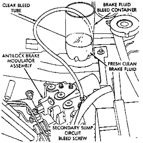c. Open modulator assembly secondary sump circuit bleeder screw at least one full turn; then, using DRB scan tool, select "Bleed ABS Hydraulic Unit" mode.