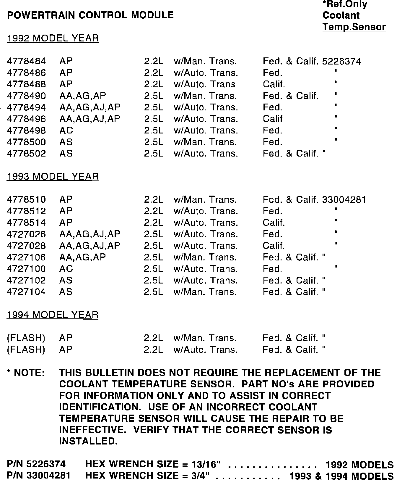 THIS BULLETIN APPLIES TO 1992 & 1993 VEHICLES EQUIPPED WITH THE 2.5L ENGINE, ALSO 1992, 1993 AND 1994 VEHICLES EQUIPPED WITH THE 2.2L ENGINE.
