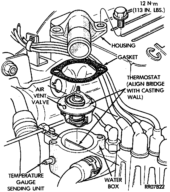 Center thermostat in water box pocket. Check that the flange is seated correctly in the countersunk portion of the intake manifold water box. Install new gasket on water box. Install housing over gasket and thermostat and torque bolts to 12 Nm (133 in. lbs.)