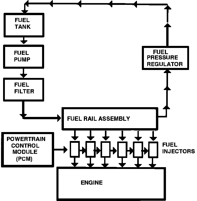 Fuel Delivery system consists of fuel tank, fuel pump, fuel filter, fuel rail, fuel injectors (6), and fuel pressure regulator.