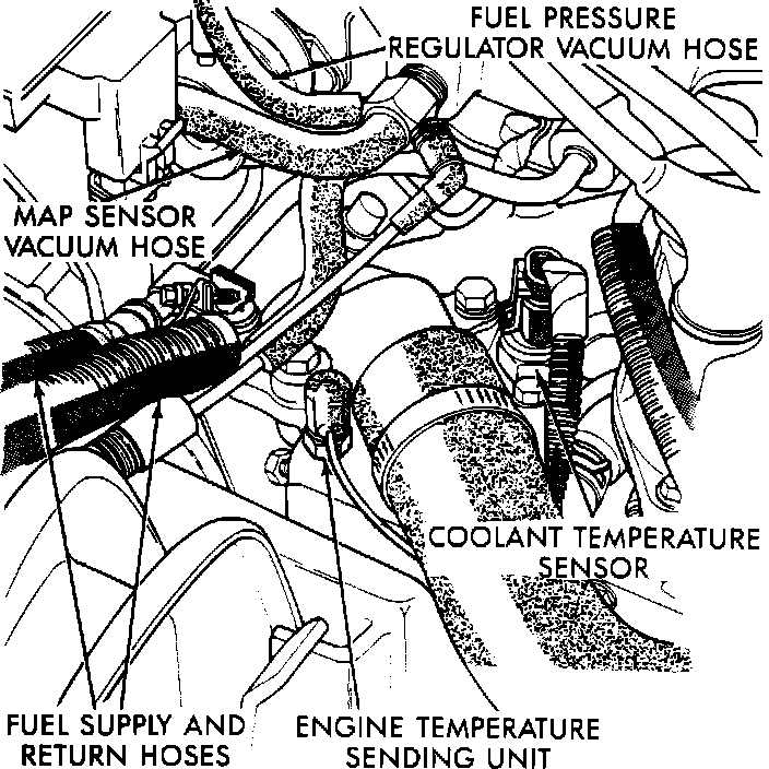5. Remove wiring connector from coolant temperature sensor. Remove EGR tube flange and vacuum connections from intake plenum. Remove fuel hoses from fuel rail.