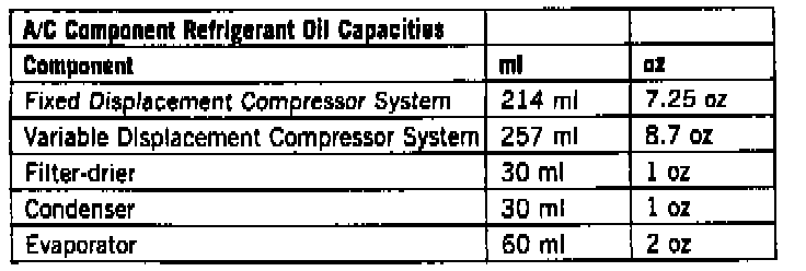 When an air-conditioning system is first assembled at the factory all of the components (except the compressor) are refrigerant oil free. After the system has been charged with R134a (refrigerant) and operated the oil in the compressor is dispursed through the lines and components. The evaporator, condenser, and filter-drier will retain a significant amount of oil, see A/C Component Refrigerant Oil Capacities chart. When a component is replaced the specified amount of refrigerant oil must be added. When the compressor is replaced, the amount of oil that is retained in the rest of the system must be drained from the replacement compressor. When a refrigerant line or component has ruptured and has released an unknown amount of oil, the A/C compressor should be removed and drained through the suction port. The filter-drier must be replaced along with the ruptured part and the oil capacity of the system minus the amount of oil still in the remaining components can be measured and poured into the suction port of the compressor.