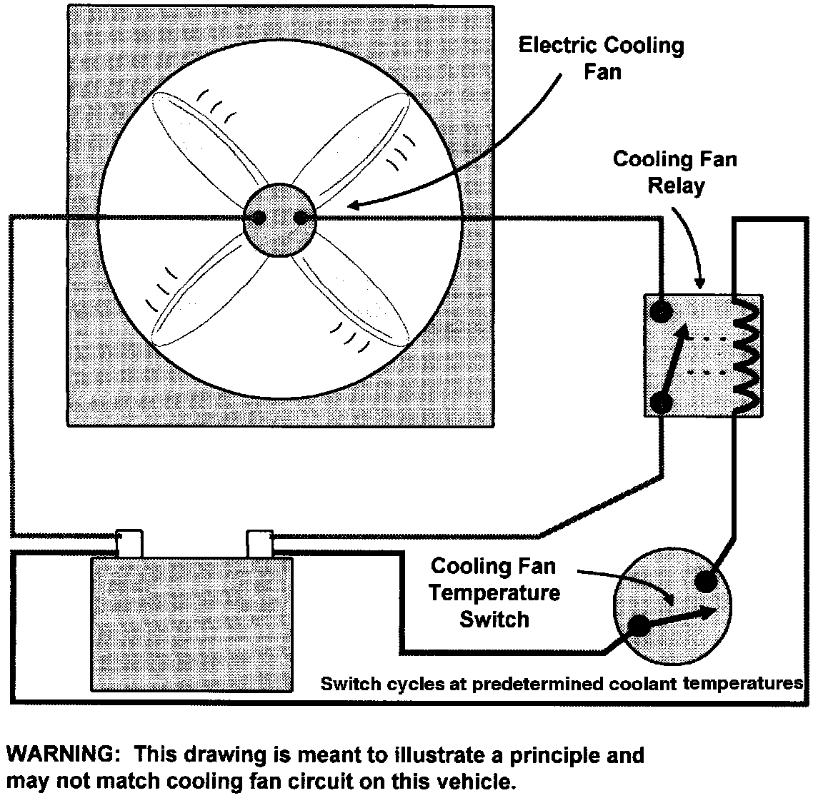 - If the thermostat opened properly, continue to allow the cooling system to warm up. As the coolant temperature reaches its maximum operating temperature the electrical cooling fan should energize. Verify the fan energizes and de-energizes.