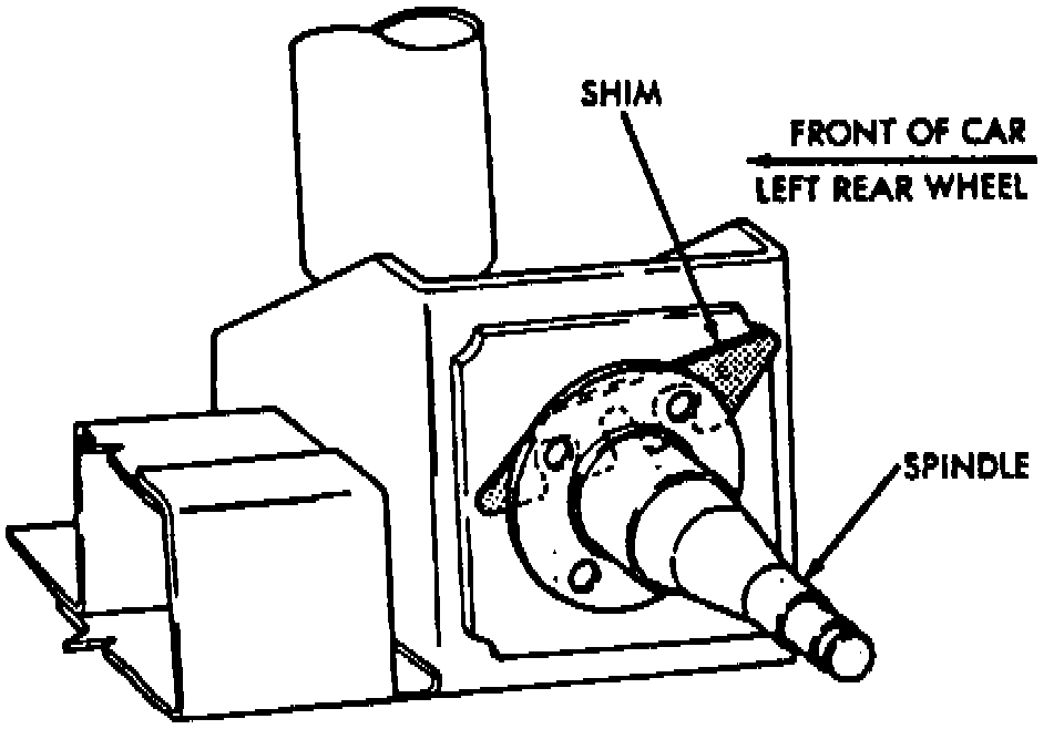 Due to the design of the rear suspension and the incorporation of stub axles or wheel spindles, it is possible to adjust the camber and toe of the rear wheels on these models. Adjustment is controlled by adding shims approximately 0.010 inch thick between the spindle mounting surface and spindle mounting plate. The amount of adjustment is approximately 0.3° per shim. Proceed as follows: