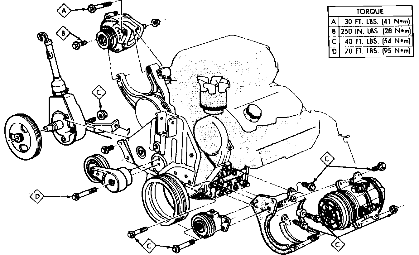 9. Install engine brackets, pulleys, and accessories as shown in Fig. 5, then the drive belts.