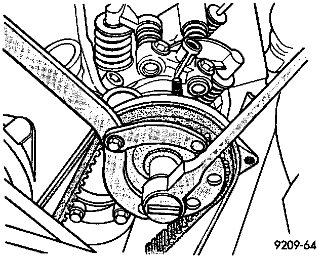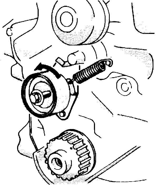 2. Install timing belt tensioner and spring. Rotate tensioner counterclockwise, Fig. 10, then temporarily tighten bolt.