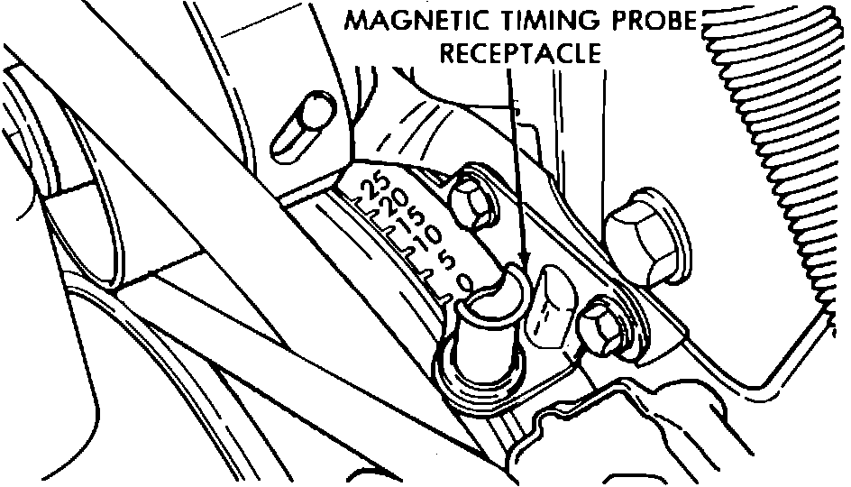 - If using a magnetic timing probe, insert into receptacle, on end of timing index, next to front crankshaft pulley. (Socket is for magnetic timing probe only.)