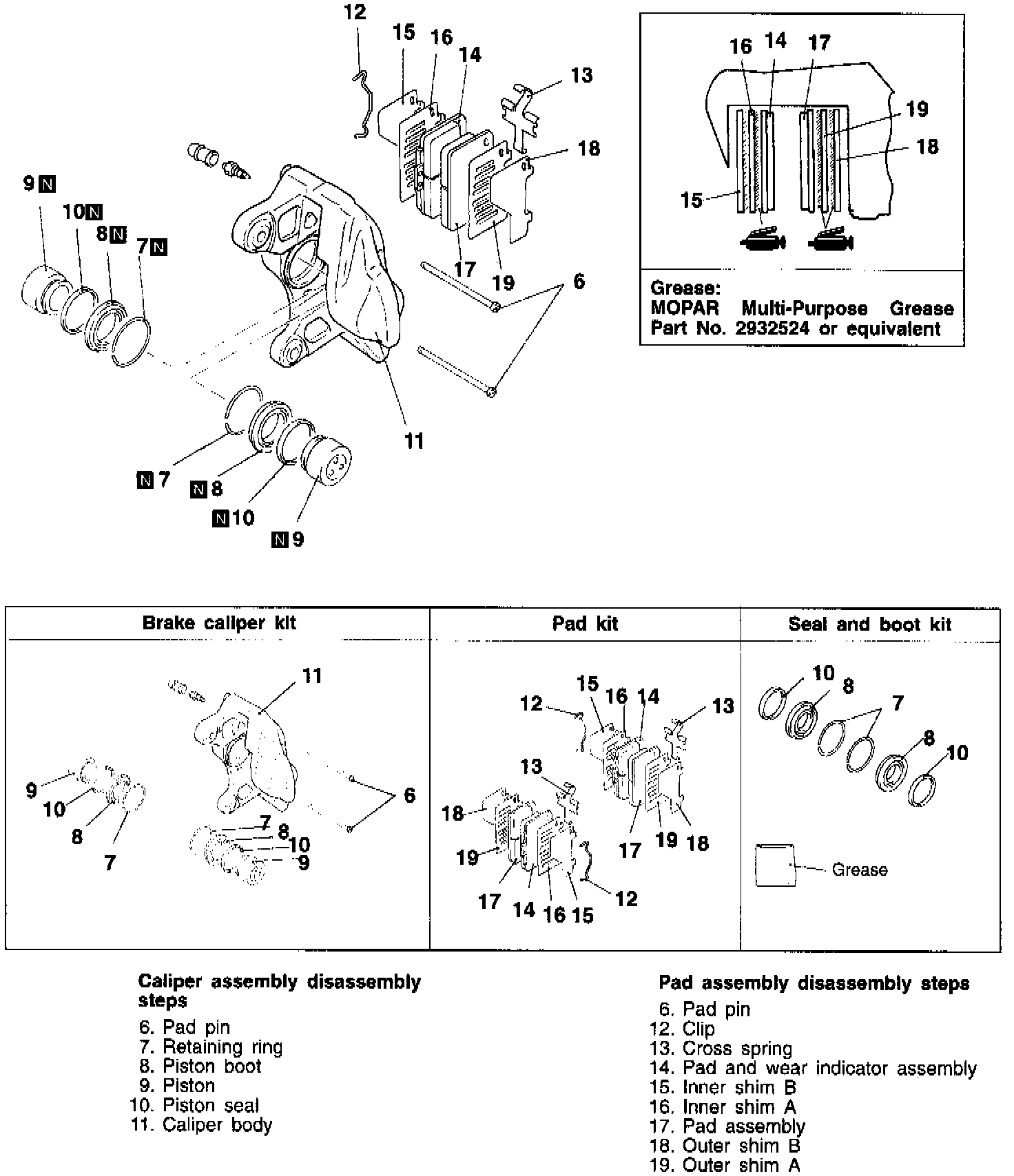 6. Apply a suitable multi-purpose grease to both sides of inner shims, then install pad assemblies and shims, pad pins and clip.