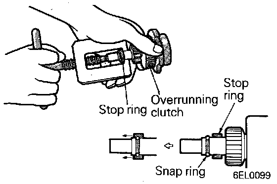 Using a suitable pulling tool, pull overrunning clutch stop ring over snap ring.