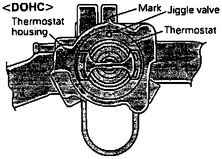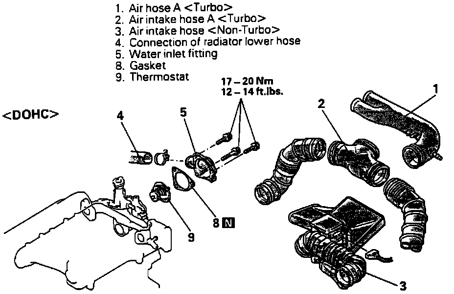 4. Remove lower radiator hose (4), three housing retaining bolts. housing (5), gasket (8) and thermostat (9).