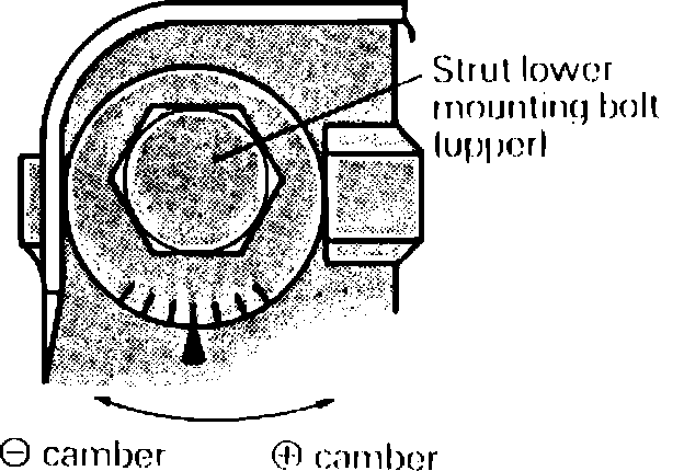To adjust camber, turn strut lower mounting bolt (upper). One graduation is equivalent to about 0.33° in camber.