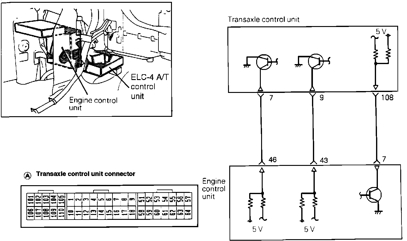 There are 3 communication lines providing torque reduction request and torque reduction execution (retared timing) signals. They connect the Engine Control Module (ECM) with the transaxle control unit. Two of these lines send 5 Volts from the ECM to the transaxle control unit. The other provides 5 Volts from the transaxle control unit to the ECM.