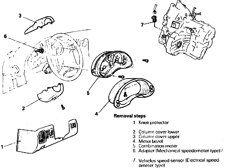 a. On models equipped with mechanical speedometer, disconnect speedometer cable at transaxle, then pull toward interior, then disconnect instrument cluster speedometer adapter by turning right or left.