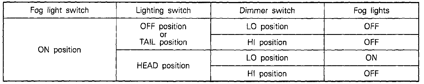 ^ When the dimmer switch is placed in the HI position or the lighting switch is placed in the TAIL or OFF position while the fog lights are ON, current supply to the fog light relay or headlight relay is cut off. As a result, the contacts of the fog light relay open, and the fog lights go out.