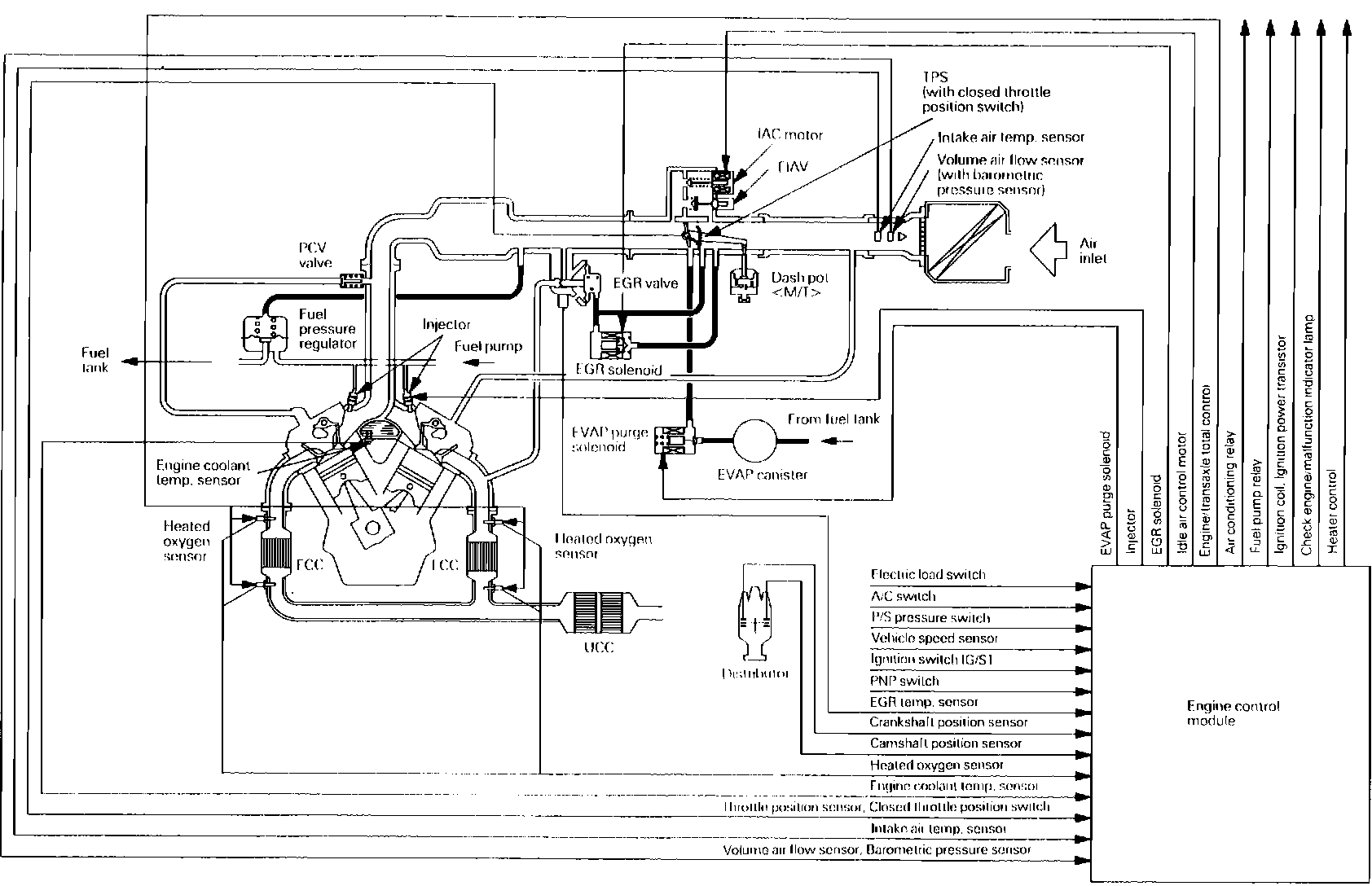 The Mitsubishi electronically controlled multipoint injection system (ECI-MULTI) maintains emission levels and fuel economy within government agency standards, while optimizing driveability. The system consists of an Electronic Control Module (ECM), control relay, wiring, sensors and actuators.