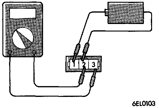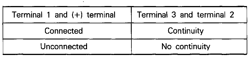 1. Connect the negative (-) terminal of the 1.5V power supply to terminal 2 of the [1][2]ignition power transistor; then check whether there is continuity between terminal 3 and terminal 2 when terminal 1 and the positive (+) terminal are connected and disconnected.